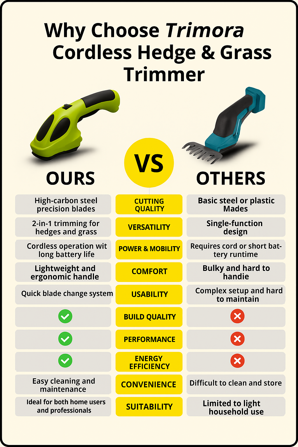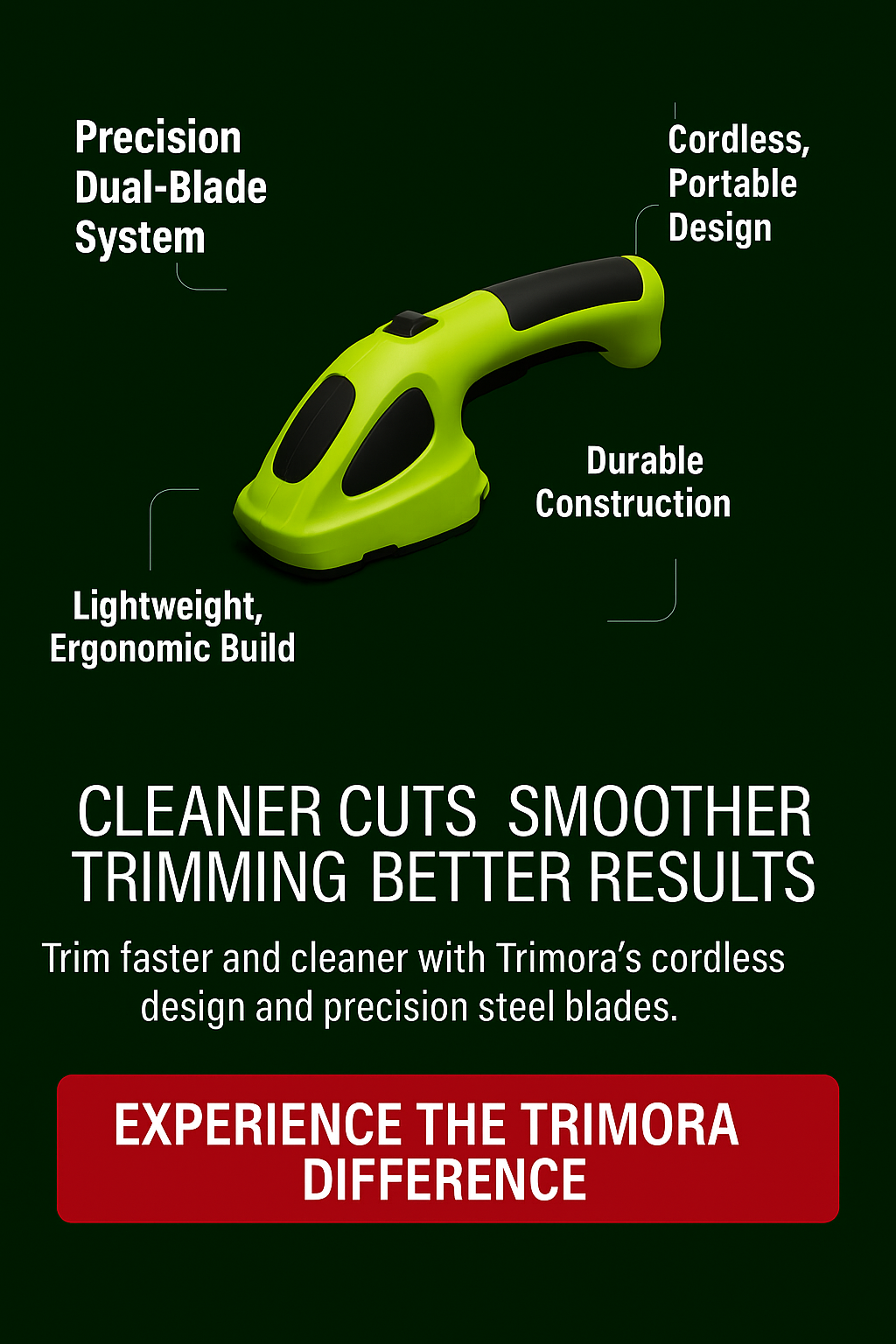 Crafted from impact-resistant materials and reinforced blades, Trimora is built to handle regular outdoor use — keeping your garden perfectly trimmed year after year.