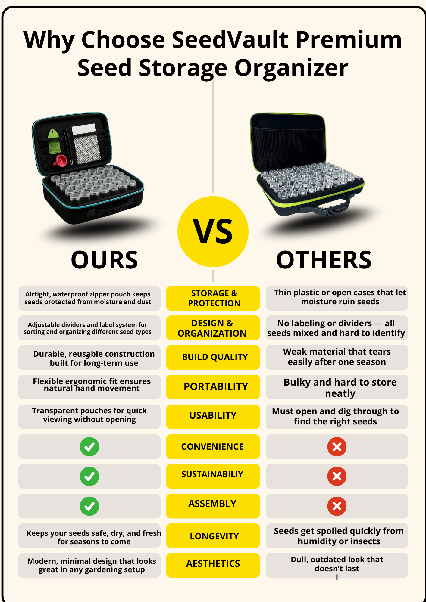 SeedVault’s durable fabric bag and smart labeling design make it easy to find and store your seeds season after season—keeping your gardening simple, clean, and efficient.